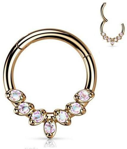 Szárvastagság: 1,2 mm. Szín: AranyÁtmérő: 8 mm. A kő színe: ÁtlátszóEz az izléses orvosi acél karika bárkinek tökéletesen kiegésziti a megjelenését. Az ékszert cirkónia köves levelek diszitik. A csillogó kövek előre néznek, emiatt septum, daith vagy tragus piercingekhez ideális választás az ékszer. Mindenképp vedd figyelembe a karika méretét, amikor a hordását tervezed. A szár 1.2 mm vastag, ami a sztenderd méret arcon hordott piercingeknél, az átmérő pedig 8 mm. A karika egy csuklós zárómechanizmussal lett ellátva, ami nagyban megkönnyiti az ékszer cseréjét; fontos szempont, ha szereted gyakran váltogatni! A csuklós résznél szét kell húzni, hogy kinyiljon, majd behelyetés után kattanásig kell összenyomni.