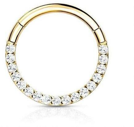 Szárvastagság: 1,2 mm. Szín: AranyÁtmérő: 8 mm. A kő színe: ÁtlátszóEz a titán karika kétféle színben rendelhető. A karika egy csuklós zárómechanizmussal rendelkezik, ami sokak kedvence. Széthúzod a szegmens résznél, beilleszted a piercingbe, és egy kattanással összezárod. Egyszerű, de nagyszerű. Az ékszer elülső részét egy sor ragyogó kő díszíti. Erre oda kell figyelned, amikor megtervezed, melyik piercingedben szeretnéd hordani. Például a kövek elhelyezkedése ideálissá teszi septum vagy daith piercingekhez, de pl. orrcimpa piercingnek lehet jobb valami mást választani.