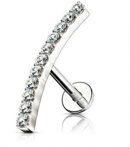 Hossz: 8 mm. Szín: EzüstA kő színe: ÁtlátszóEz a labret minden bizonnyal a legfeltűnőbb darabok egyike, hiszen a hosszú kővel kirakott ívet nehéz nem észrevenni. Az ékszer íves része rézből készült, a többi pedig orvosi acélból. Az ív eléggé hosszú, körülbelül 15 mm. Pontosan ezért tökéletes választás lehet akár egy helix piercingnek is, vagy akár egy általános fülpiercingként is hordható, hiszen tökéletesen rásimul a fülcimpára.