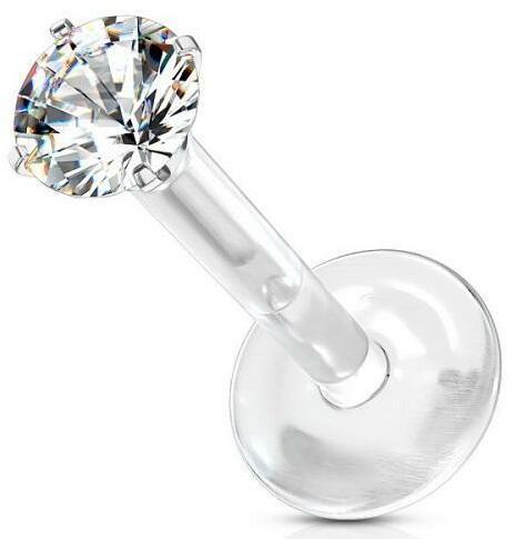 Szárvastagság: 1,2 mm. Hossz: 8 mm. Szín: EzüstGolyó mérete: 3 mm. A kő színe: ÁtlátszóA PTFE szárú labret ékszerek leginkább a száj körül használtak. Különösen jók a fogak és íny egészségének megőrzésére, mivel a PTFE egy puha és rugalmas anyag. Labret ékszereket gyakran használnak a fülben vagy az ajkakban a lapos hátlap miatt. Néhány fül piercingbe, mint a Tragusba nehéz lehet egy tipikus zárrendszerrel rendelkező ékszert behelyezni, itt a keskeny hátlap jobban használható.