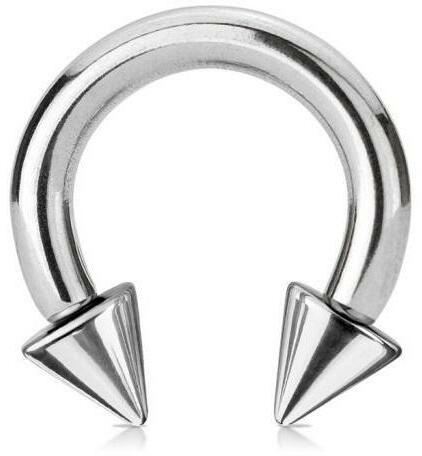 Szárvastagság: 1,2 mm. Hossz: 8 mm. Szín: EzüstDísz mérete: 3. mmEttől a tüskés végű patkó piercingtől garantáltan merészebbnek fogsz tűnni. Viseld mellbimbó, orr, szemöldök, ajak vagy akármilyen más piercingként