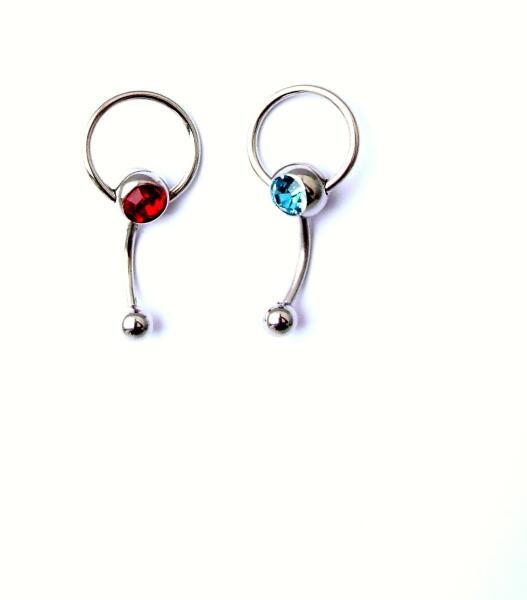 Piercing acél és cirkon sebészeti acélból és díszített piros vagy világos kék cirkon. Piercing acél és cirkon átmérője 0,1 cm méretű 3.2 cm