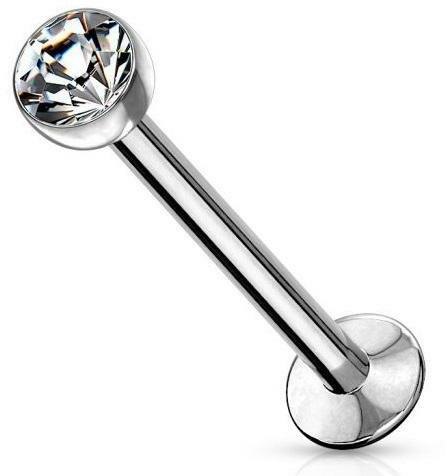 Hossz: 6 mm. Golyó mérete: 3 mm. Szín: EzüstA kő színe: ÁtlátszóA képen látható labret hasonló az átlagos köves labretekhez azzal a különbséggel, hogy ez nem menetes, hanem push-in kialakítású. A kődísz egy apró tűhöz van erősítve, aminek a vége a szárba nyomható. Amint az a képen is látható, a tű enyhén hajlított, így szorosan beleillik a szárba. Ennek köszönhetően nem sérti fel a bőröd behelyezéskor. Orvosi acélból készült, vastagsága 1,2 mm. A labretet különböző piercingként hordhatod. Általában helixként vagy tragusként hordják, de ajak piercingként is viselheted.