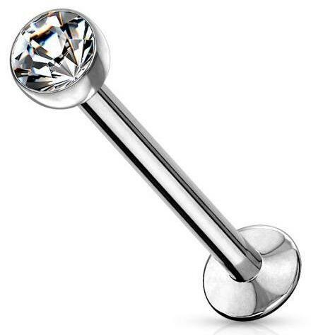 Hossz: 8 mm. Golyó mérete: 3 mm. Szín: EzüstA kő színe: ÁtlátszóA képen látható labret hasonló az átlagos köves labretekhez azzal a különbséggel, hogy ez nem menetes, hanem push-in kialakítású. A kődísz egy apró tűhöz van erősítve, aminek a vége a szárba nyomható. Amint az a képen is látható, a tű enyhén hajlított, így szorosan beleillik a szárba. Ennek köszönhetően nem sérti fel a bőröd behelyezéskor. Orvosi acélból készült, vastagsága 1,2 mm. A labretet különböző piercingként hordhatod. Általában helixként vagy tragusként hordják, de ajak piercingként is viselheted.
